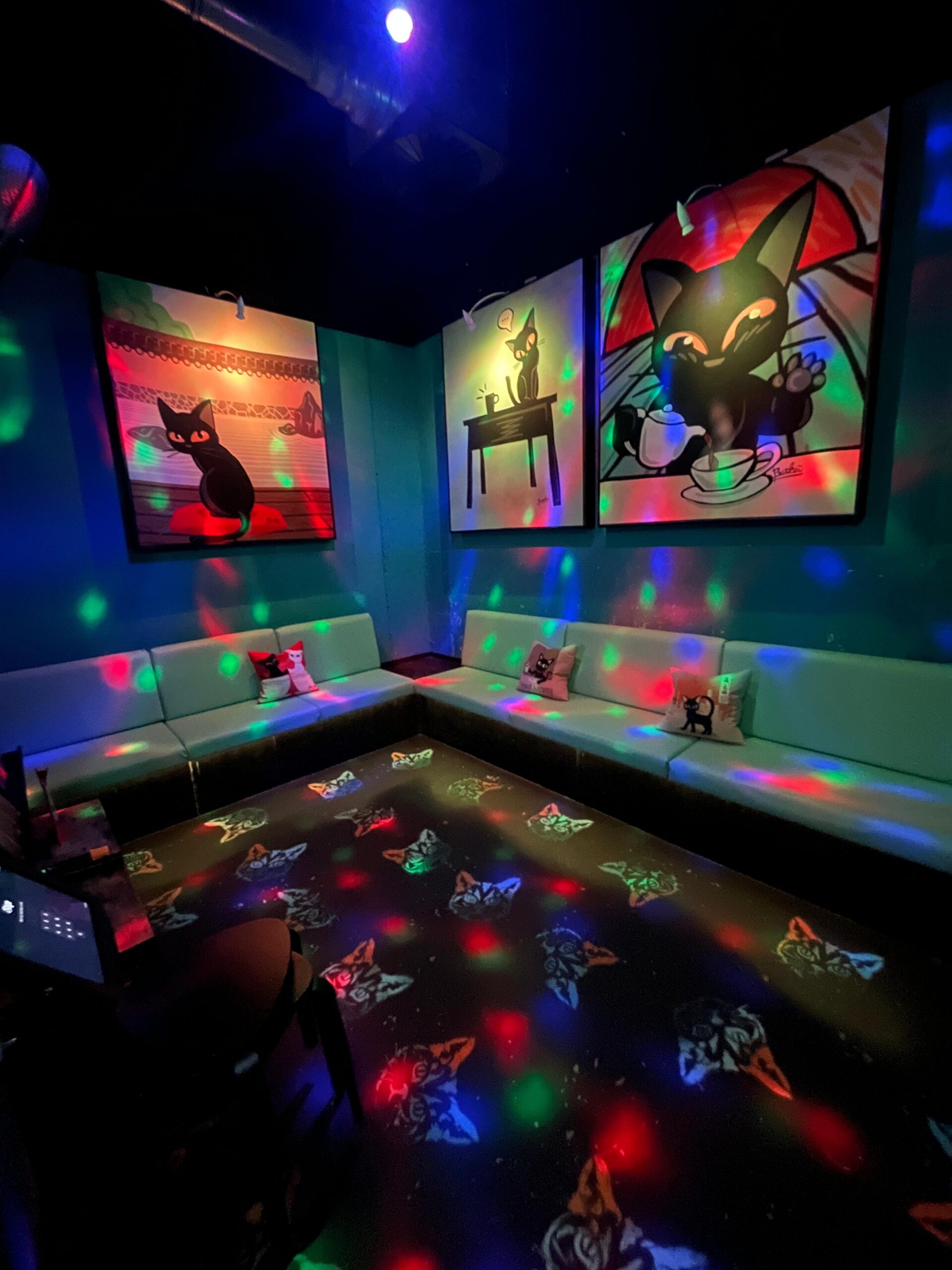 Can’t have a cat but would like to visit one? Our house cat, Whim, is watching from all the walls, his yellow eyes judging your song selection while he sips his coffee. Nickelback? Really? (Don’t worry, the room is soundproof. What you sing in the box stays in the box.)
